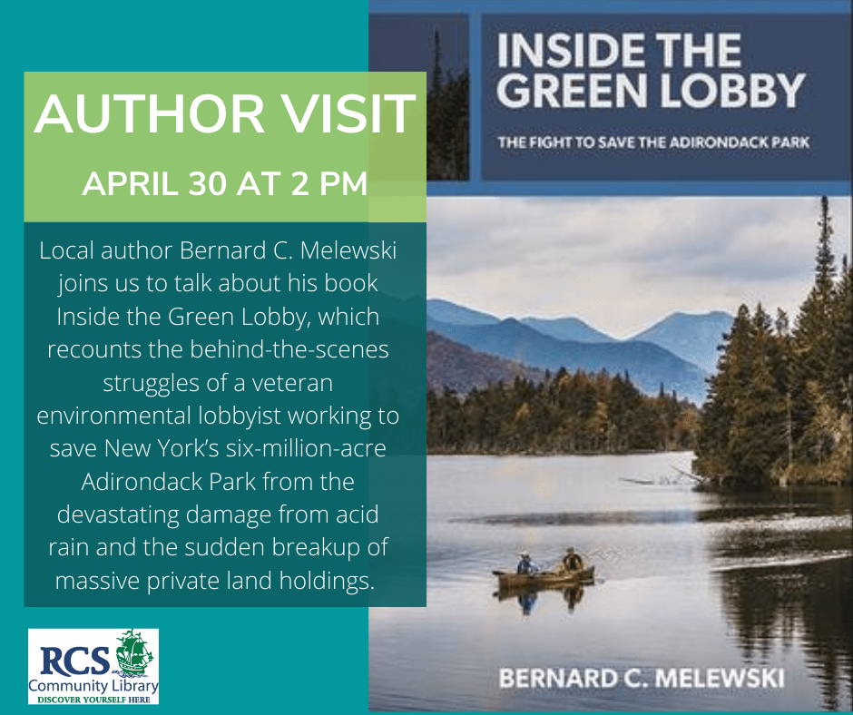 Mark your Calendars! Join the RCS Community Library and local author Bernard Melewski on April 30th at 2pm to learn about his book Inside the Green Lobby. This book recounts the behind-the-scenes struggles of a veteran environmental lobbyist fighting to save New York’s, Adirondack Park.