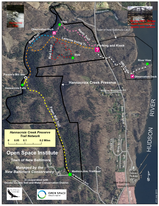 After a moderately steep ascent from the parking area, the Irving Trail serves as the primary walkway through the Hannacroix Creek Preserve. At the top of the ridge, first the RED, then the NORTH and finally the BLUE trails branch off, while the main Irving Trail continues west, dropping down to and paralleling the Hannacroix Creek. The Irving Trail ends at the Hannacroix Creek Falls. The Falls cascade into the Hannacroix Creek over an approximate 20’ drop. The Paper Mill Trail continues south from the Falls, passing by the original poor farm for New Baltimore, then connects to Madison Avenue at the western boundary of the Hamlet. Round-trip from the main parking lot to the falls and back is just under 1.5 miles