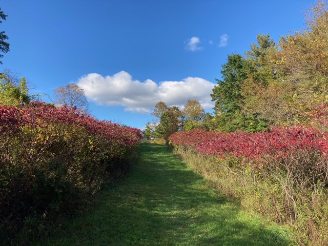 Leaving the barn, a mown farm path passes through open fields to be maintained for grassland bird’s habitat. An overlook path leads up to a viewshed then drops through a suite of sumac, turns through a pine glade, passes by a man-made pond to the site of a residence, intended for a previous owner, ending at an overlook with terrific views of the Hudson River and Hoteling Island. Beyond the junction with the Overlook Path, the Farm Path drops down behind a low ridge, following a swale to the original farm equipment access road along the northern edge of the property. It continues towards the river and south, passing through mature woods where eagles are often seen at ridge height just above scouting out the river shore. At height of land, continue south [and loop back to the overlook] or drop-down north along the trail to the quarry area, an amphitheater-like residual of historic quarrying activities, and on the south, along the river to a nice sandy beach and the remains of the ice house foundations.