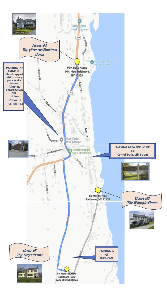 We begin at 6 pm at the first home, 89 Main Street in the hamlet of New Baltimore, with appetizers. At 7 pm we continue on to home #2, 979 State Route 144, with more delectable finger foods. At 8 pm we continue our evening with a brief stroll down Mill Street, right along the Hudson to home #3, 56 Mill Street, to enjoy wonderful desserts with a beautiful view of the river.